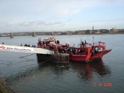 "Die Feuerwehr Mainz rettet Leben - Hilfe einmal anders!" Unter diesem Motto fand am heutigen Silvestermorgen zum 36. Mal das Abschwimmen der Feuerwehr Mainz statt. 37 Taucherrinnen und 162 Taucher von Feuerwehr, DLRG, Polizei und privaten Tauchclubs aus dem gesamten Rhein-Main-Gebiet sprangen nach dem Startschuss durch den Brandschutzdezernenten Wolfgang Reichel vom Feuerlöschboot Franz Anton Schneider in die 7,0°C kalten Fluten des Rheins. Bei Außentemperaturen von 9°C und Sonnenschein waren die Zuschauer zahlreich am Rheinufer erschienen.
